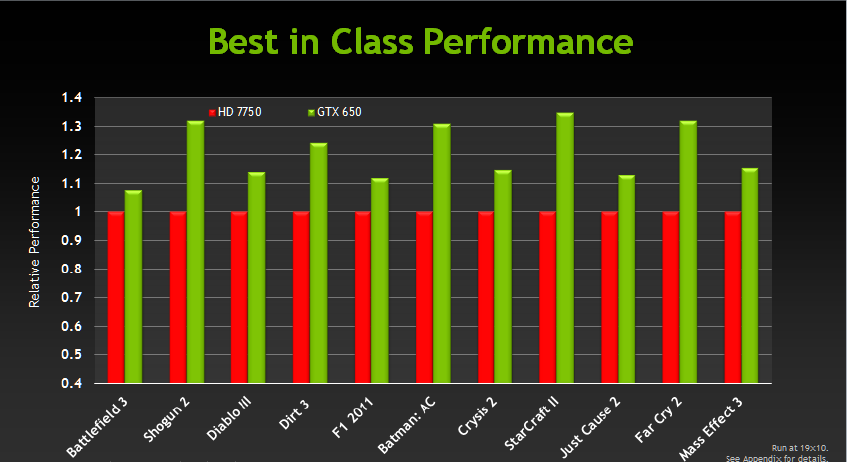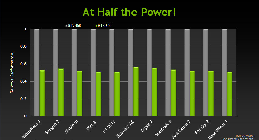 Dai test comparativi NVIDIA, comparando la nuova GTX 650 con la prima generazione di schede DX11, possiamo notare ad esempio che la nuova GPU Kepler può vantare un 20% in più di prestazioni in tutti i giochi e al tempo stesso consumando la metà rispetto alla GTS 450.